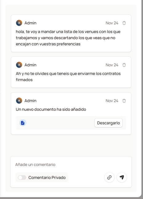 Receive schedules, contracts, and briefings directly from the assigned task. Upload your own files, share technical sheets, and keep all documentation organized.